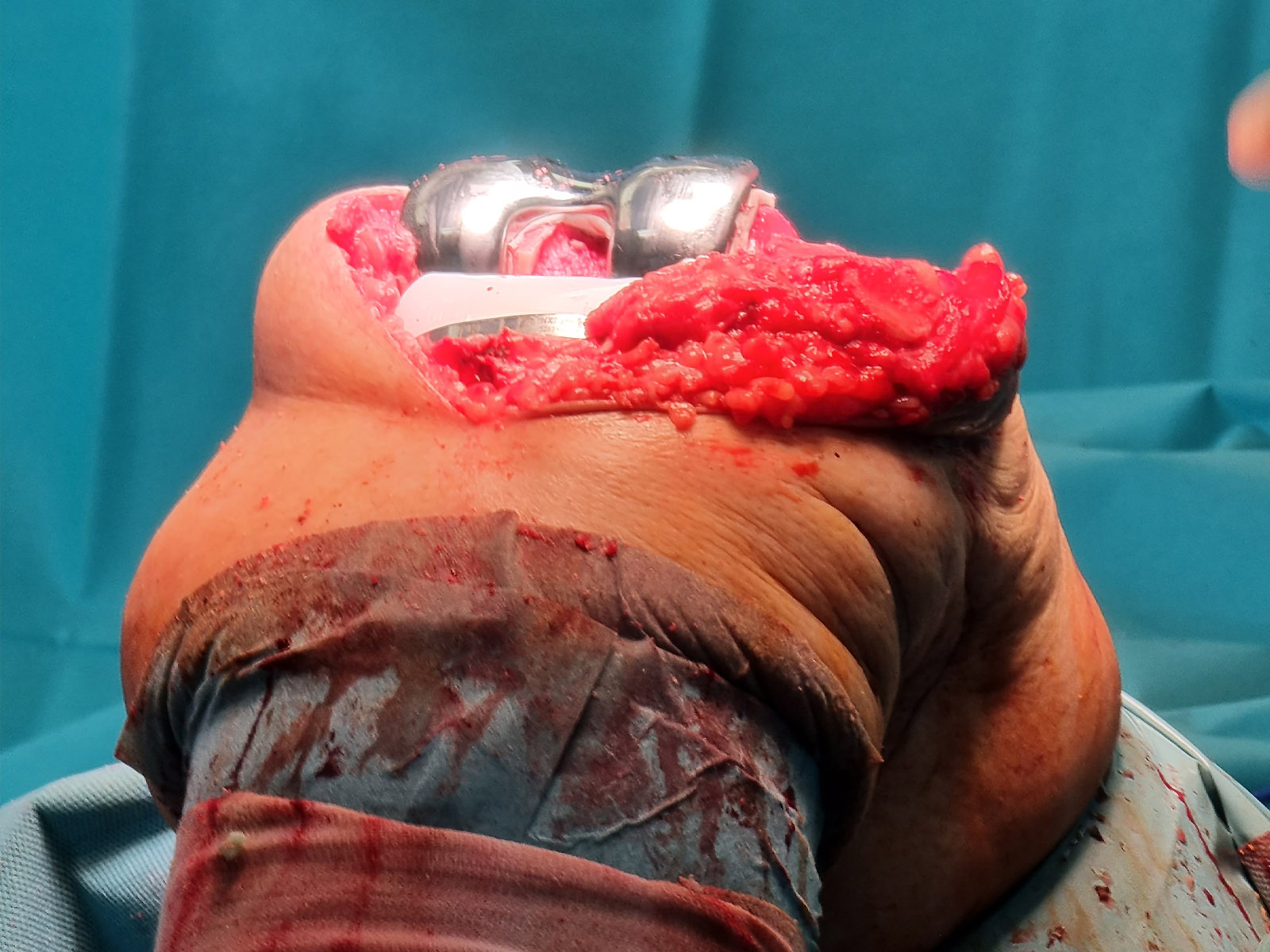 Vollständige Ersatz des Kniegelenks durch ein künstliches Kniegelenk (Knieendoprothese (Knie-TEP)) kurz vor dem chirurgischen Vernähen.