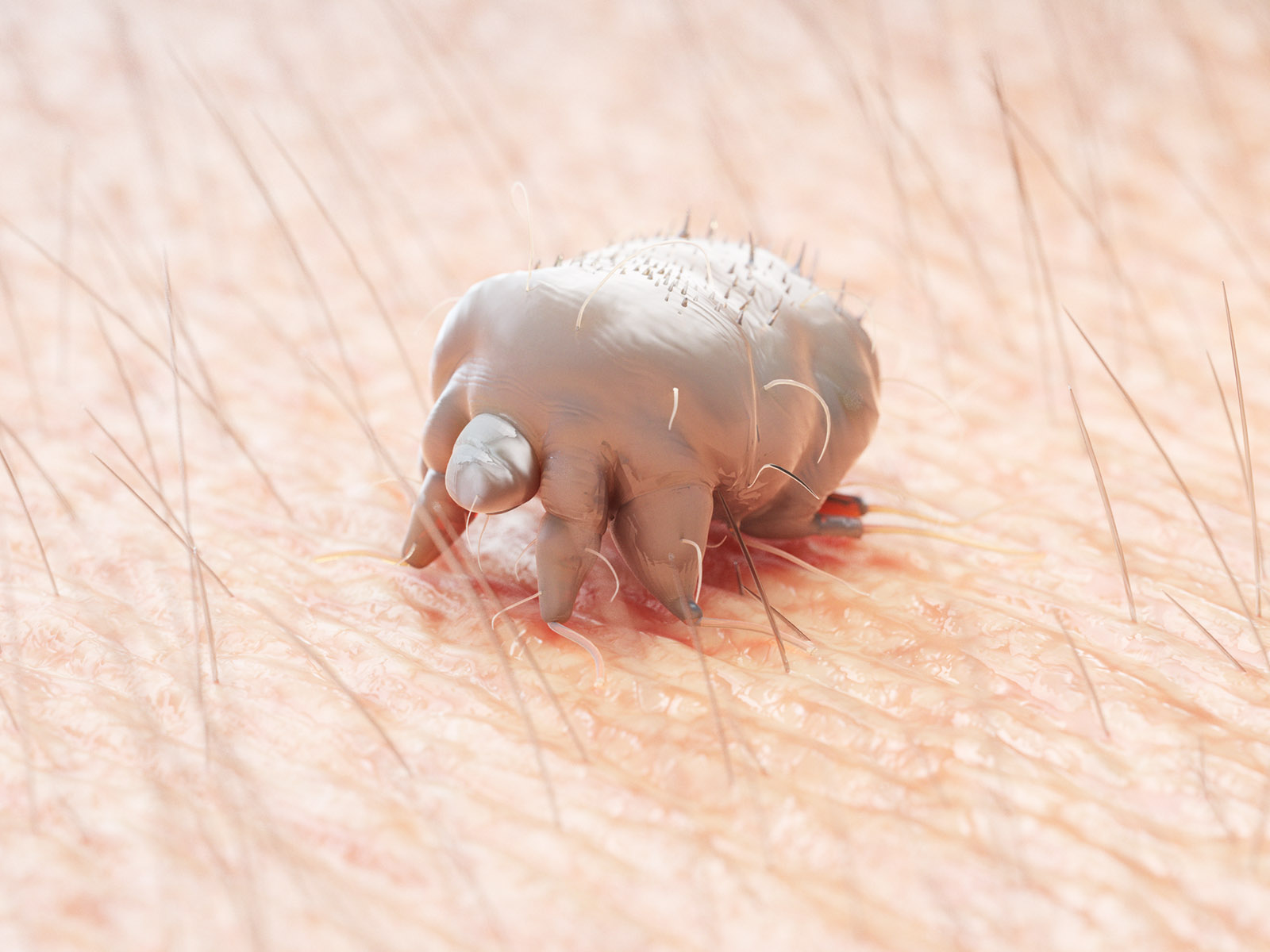 Naturgetreue Illustration einer Krätzemilbe (Scabies) auf der menschlichen Haut. Die Milben graben sich in die oberste Hautschicht ein und legen dort Eier ab.
