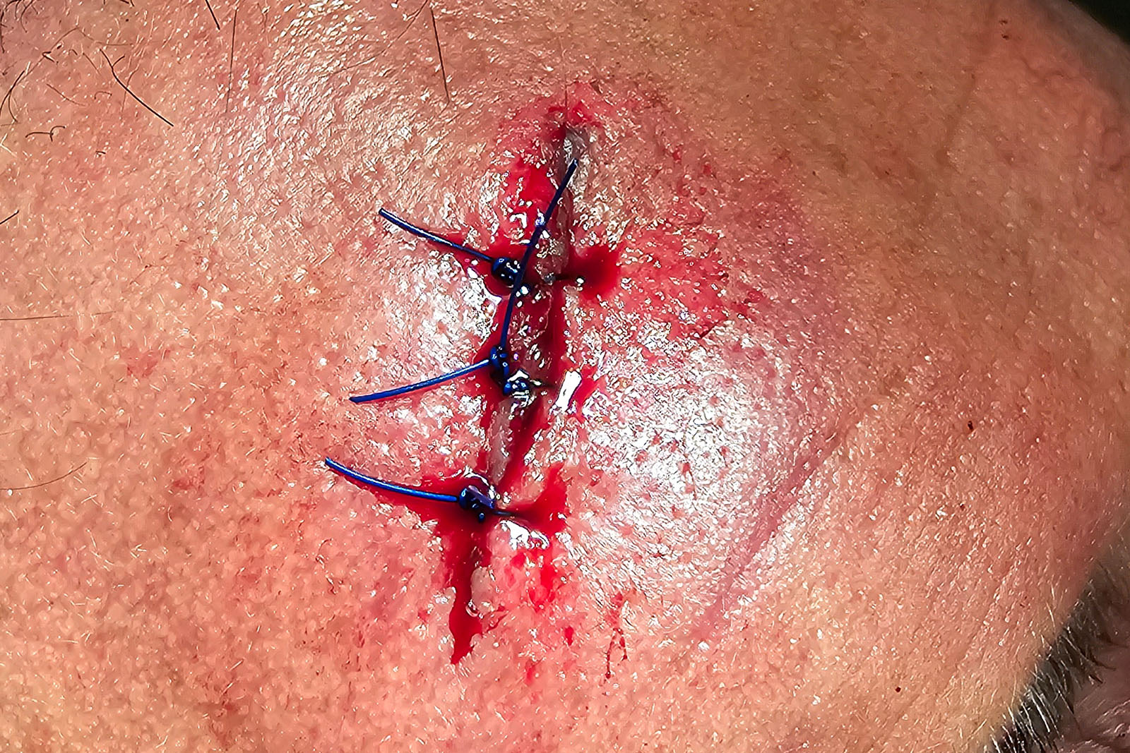 Eine Kopfplatzwunde oberhalb der rechten Augenbraue nach Sturz des Patienten, die chirurgisch mit einer Hautnaht versorgt wurde.