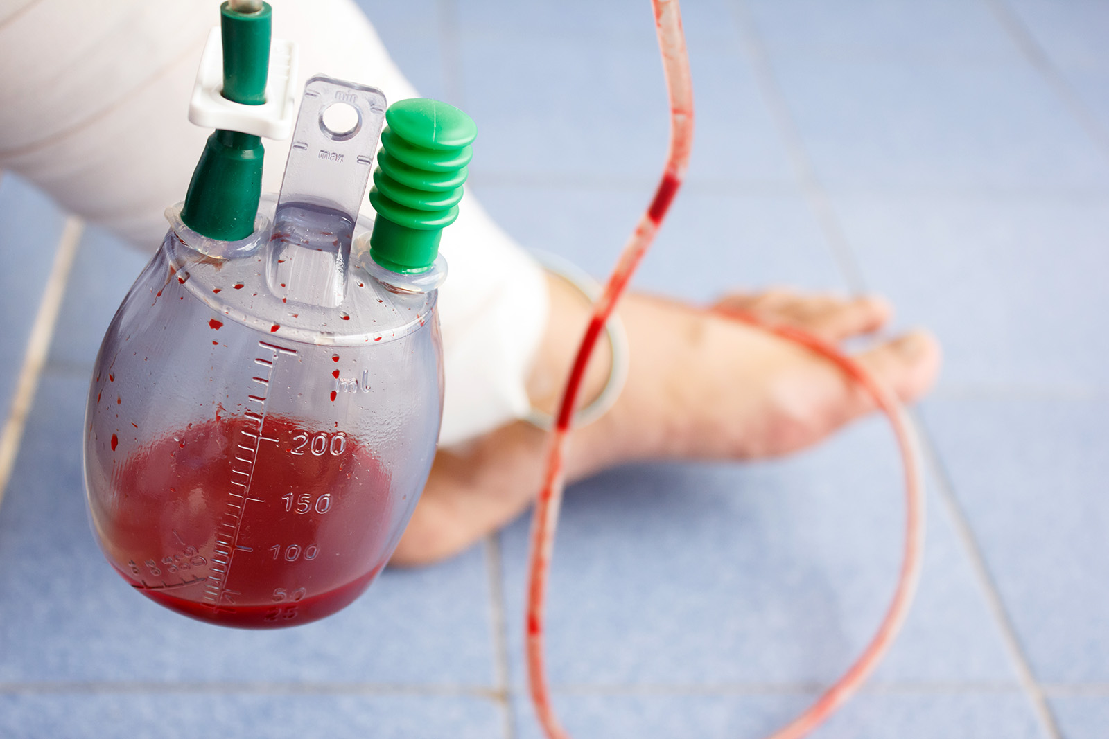 Patient, dem nach der Operation am linken Schienbein, eine Redondrainage gelegt wurde. Diese sorgt durch das geschlossenes System mit kontrolliertem Sog (Unterdruck) für einen Abfluss von Wundsekret.