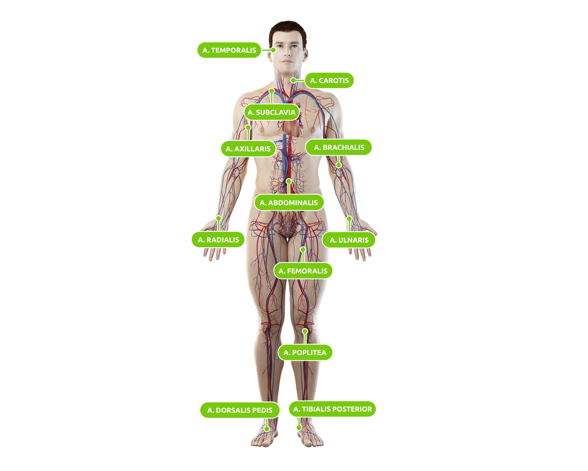 Der Puls wird dort ertastet, wo eine Arterie dicht unter der Haut verläuft und gegen eine feste Unterlage (z.B. Knochen) gedrückt werden kann. Diese lauten: Arteria temporalis ➜ Arteria carotis ➜ Arteria subclavia ➜ Arteria axillaris ➜ Arteria brachialis ➜ Arteria radialis ➜ Arteria abdominalis ➜ Arteria ulnaris ➜ Arteria femoralis ➜ Arteria poplitea ➜ Arteria tibialis posterior ➜ Arteria dorsalis pedis